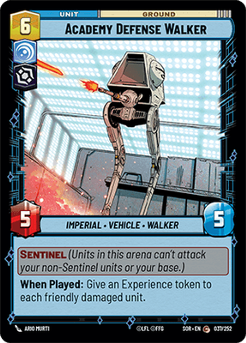 Academy Defense WalkerImperial • Vehicle • WalkerSentinel (Units in this arena can't attack your non-Sentinel units or your base.) When Played: Give an Experience token to each friendly damaged unit.Power: 5Health: 5Ario Murti