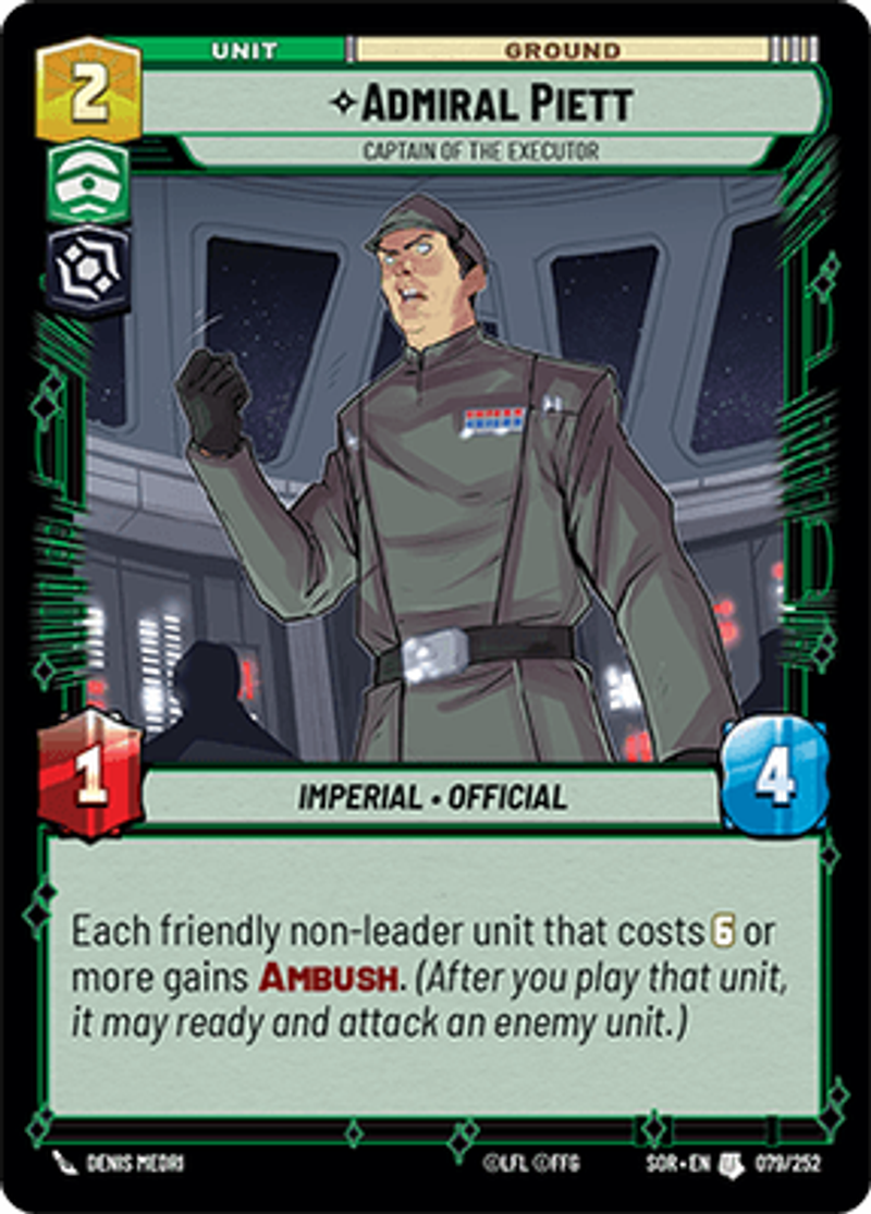 Admiral PiettCaptain of the ExecutorImperial • OfficialEach friendly non-leader unit that costs 6 or more gains Ambush. (After you play that unit, it may ready and attack an enemy unit.)Power: 1Health: 4Denis Medri