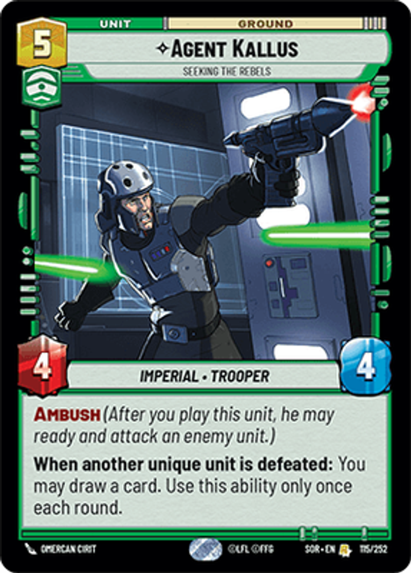 Agent KallusSeeking the RebelsImperial • TrooperAmbush (After you play this unit, he may ready and attack an enemy unit.) When another unique unit is defeated: You may draw a card. Use this ability only once each round.Power: 4Health: 4Omercan Cirit