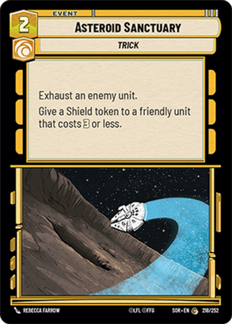 Asteroid SanctuaryTrickExhaust an enemy unit. Give a Shield token to a friendly unit that costs 3 or less.Rebecca Farrow