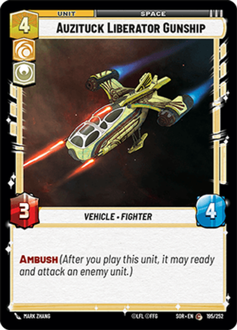 Auzituck Liberator GunshipVehicle • FighterAmbush (After you play this unit, it may ready and attack an enemy unit.)Power: 3Health: 4Mark Zhang