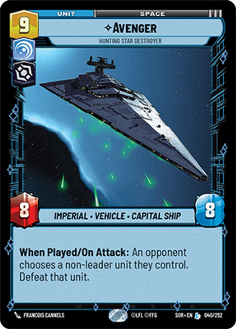 AvengerHunting Star DestroyerImperial • Vehicle • Capital ShipWhen Played/On Attack: An opponent chooses a non‑leader unit they control. Defeat that unit.Power: 8Health: 8Francois Cannels