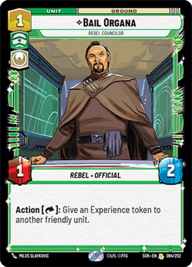 Bail OrganaRebel CouncilorRebel • OfficialAction [Exhaust]: Give an Experience token to another friendly unit.Power: 1Health: 2Milos Slavkovic