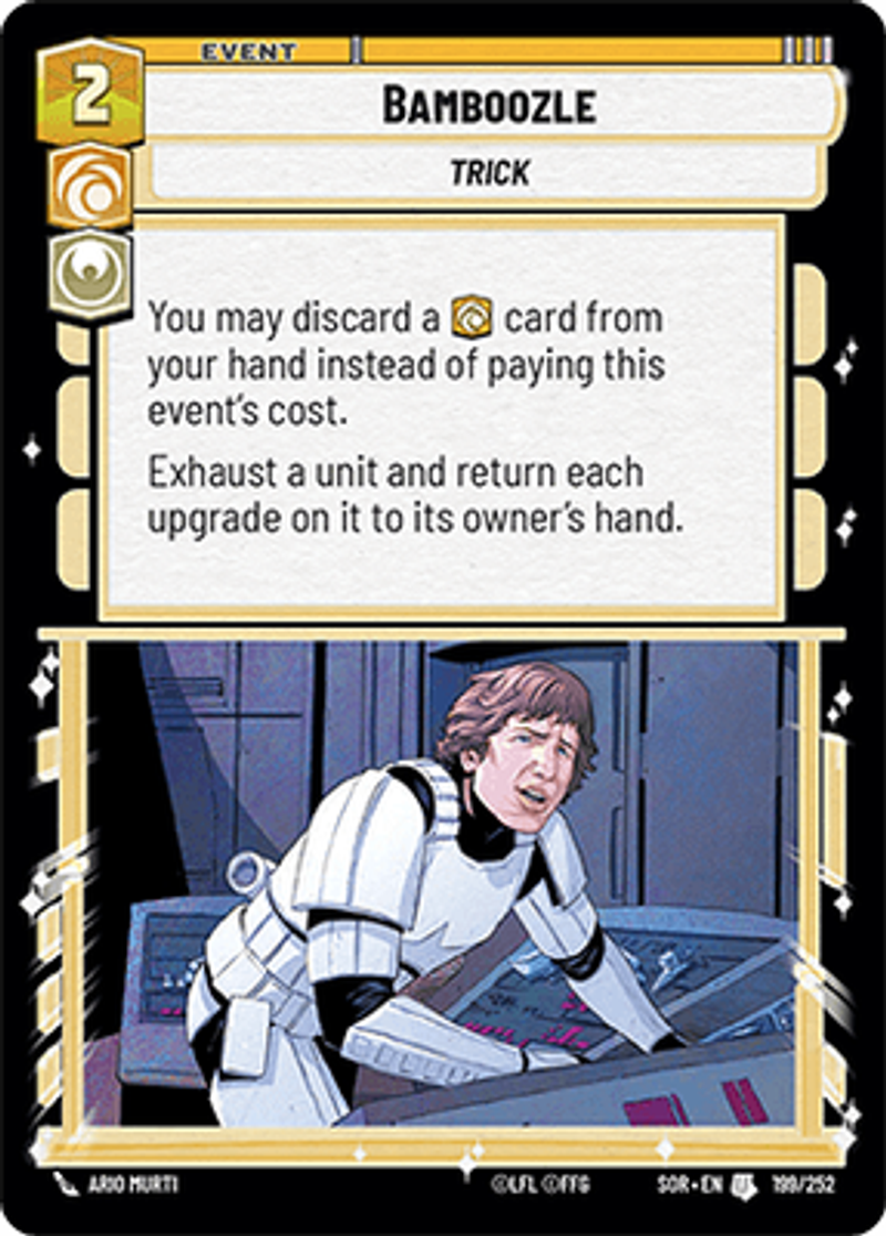 BamboozleTrickYou may discard a [Cunning] card from your hand instead of paying this event's cost. Exhaust a unit and return each upgrade on it to its owner's hand.Ario Murti