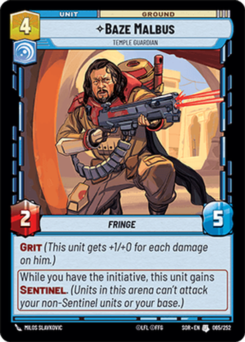 Baze MalbusTemple GuardianFringeGrit (This unit gets +1/+0 for each damage on him.) While you have the initiative, this unit gains Sentinel. (Units in this arena can’t attack your non-Sentinel units or your base.)Power: 2Health: 5Milos Slavkovic