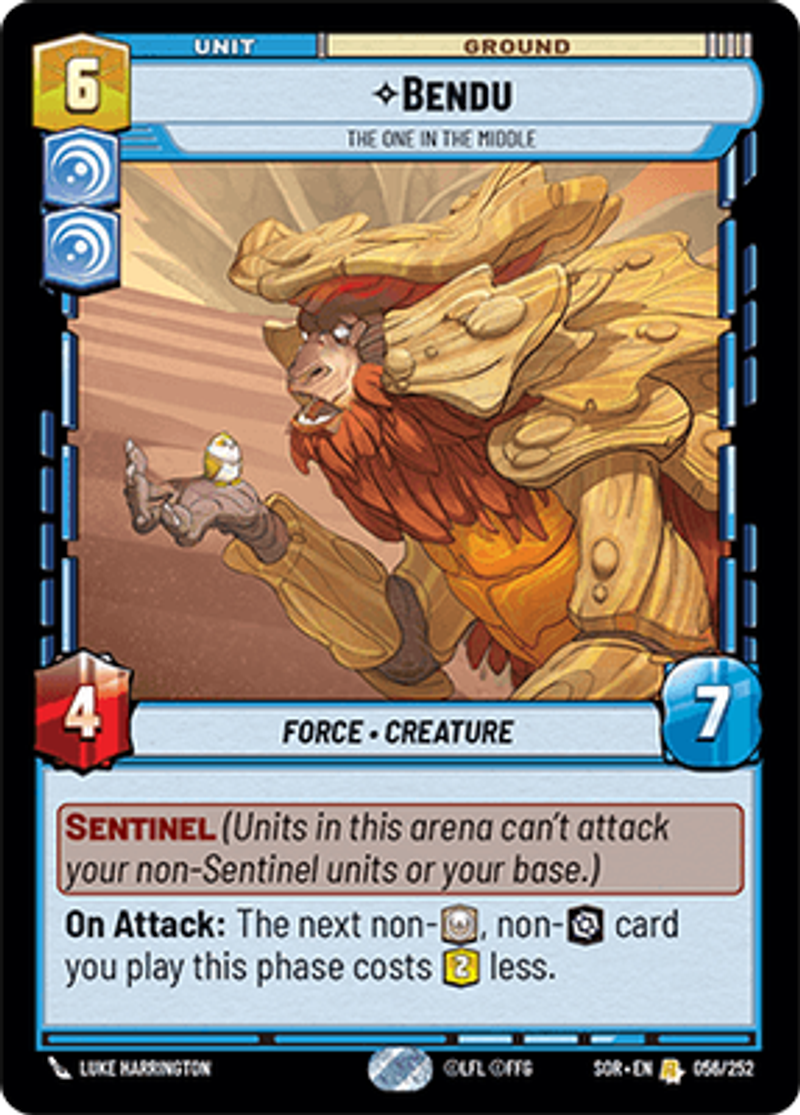 BenduThe One in the MiddleCreature • ForceSentinel (Units in this arena can’t attack your non-Sentinel units or your base.) On Attack: The next non-[Heroism], non-[Villainy] card you play this phase costs [2 resources] less.Power: 4Health: 7Luke Harrington