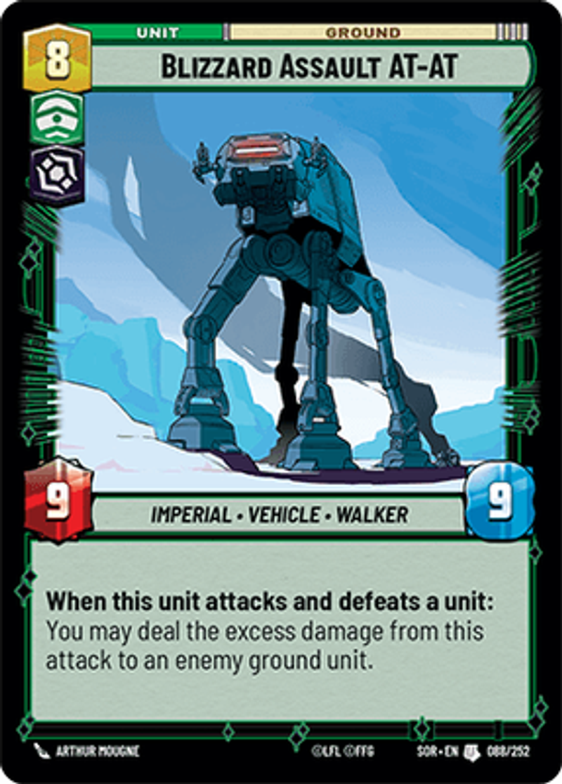 Blizzard Assault AT-ATImperial • Vehicle • WalkerWhen this unit attacks and defeats a unit: You may deal the excess damage from this attack to an enemy ground unit.Power: 9Health: 9Arthur Mougne