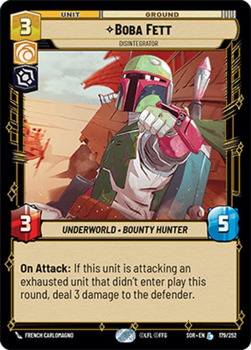 Boba FettDisintegratorUnderworld • Bounty HunterOn Attack: If this unit is attacking an exhausted unit that didn't enter play this round, deal 3 damage to the defender.Power: 3Health: 5French Carlomagno