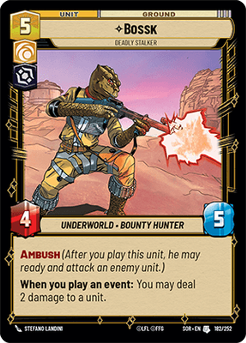 BosskDeadly StalkerUnderworld • Bounty HunterAmbush (After you play this unit, he may ready and attack an enemy unit.) When you play an event: You may deal 2 damage to a unit.Power: 4Health: 5Stefano Landini