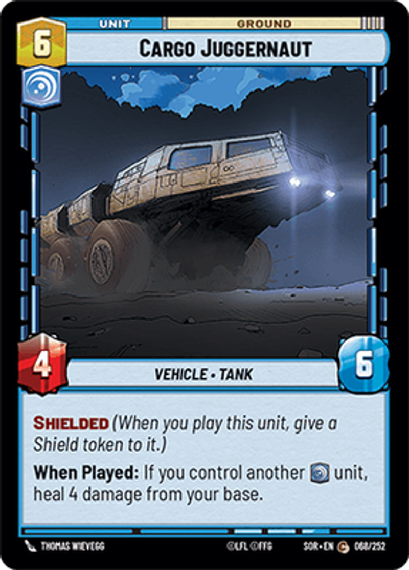 Cargo JuggernautVehicle • TankShielded (When you play this unit, give a Shield token to it.) When Played: If you control another [Vigilance] unit, heal 4 damage from your base.Power: 4Health: 6Thomas Wievegg