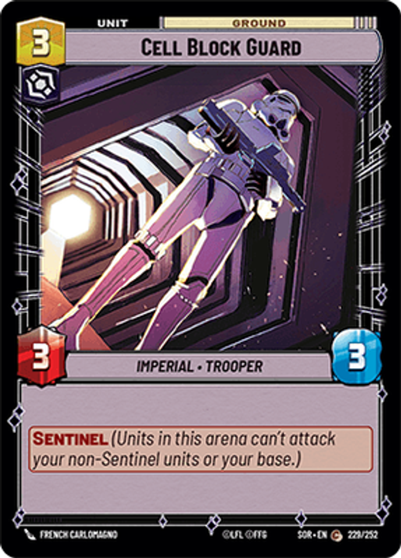 Cell Block GuardImperial • TrooperSentinel (Units in this arena can't attack your non-Sentinel units or your base.)Power: 3Health: 3French Carlomagno