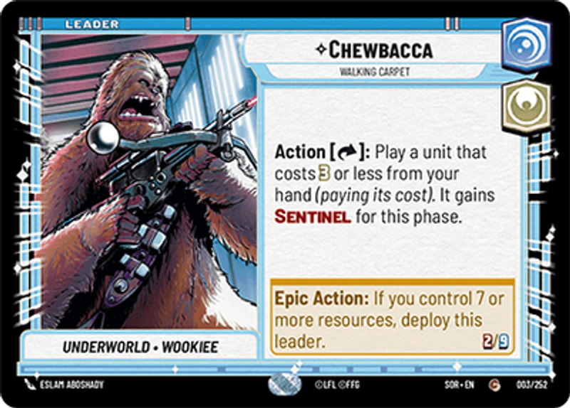 ChewbaccaWalking CarpetUnderworld • WookieeAction [exhaust]: Play a unit that costs 3 or less from your hand (paying its cost). It gains Sentinel for this phase.Power: 2Health: 9Eslam AboShady