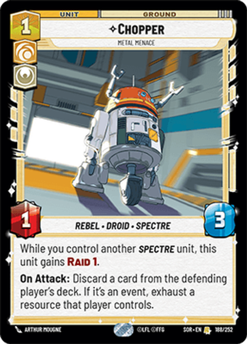 ChopperMetal MenaceRebel • Droid • SpectreWhile you control another SPECTRE unit, this unit gains Raid 1. On Attack: Discard a card from the defending player's deck. If it's an event, exhaust a resource that player controls.Power: 1Health: 3Arthur Mougne