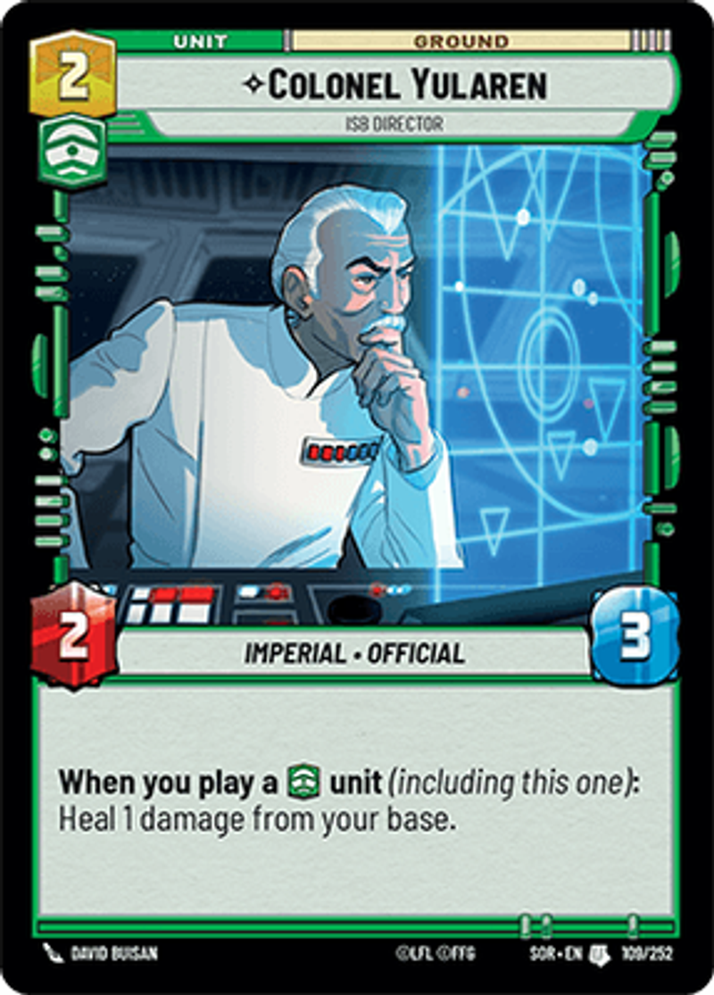 Colonel YularenISB DirectorImperial • OfficialWhen you play a [Command] unit (including this one): Heal 1 damage from your base.Power: 2Health: 3David Buisan