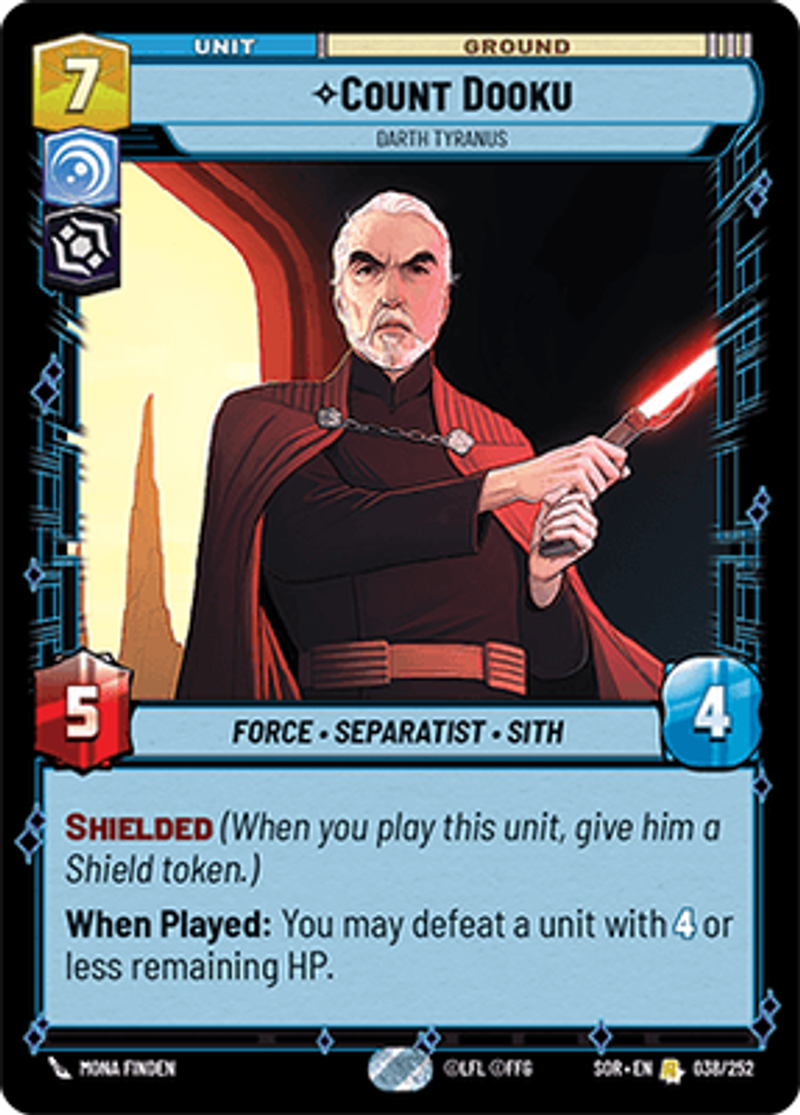 Count DookuDarth TyranusForce • Sith • SeparatistShielded (When you play this unit, give him a Shield token.) When Played: You may defeat a unit with 4 or less remaining HP.Power: 5Health: 4Mona Finden
