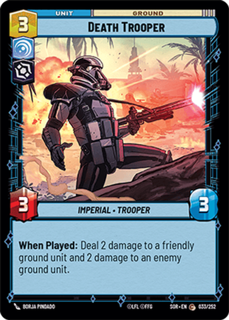 Death TrooperImperial • TrooperWhen Played: Deal 2 damage to a friendly ground unit and 2 damage to an enemy ground unit.Power: 3Health: 3Borja Pindado