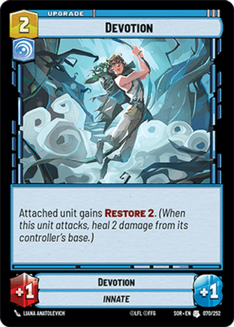 DevotionInnateAttached unit gains Restore 2. (When this unit attacks, heal 2 damage from its controller’s base.)Power: 1Health: 1Liana Anatolevich