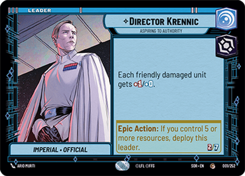 Director KrennicAspiring to AuthorityImperial • OfficialEach friendly damaged unit gets +1/+0. Power: 2Health: 7Ario Murti