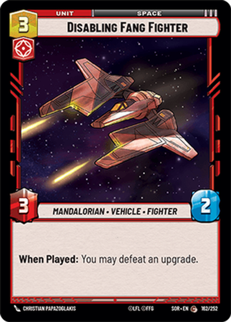 Disabling Fang FighterMandalorian • Vehicle • FighterWhen Played: You may defeat an upgrade.Power: 3Health: 2Christian Papazoglakis