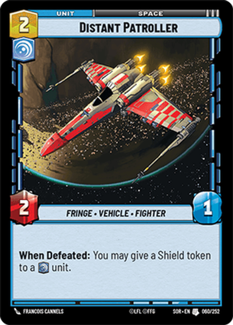 Distant PatrollerFringe • Vehicle • FighterWhen Defeated: You may give a Shield token to a [Vigilance] unit.Power: 2Health: 1Francois Cannels