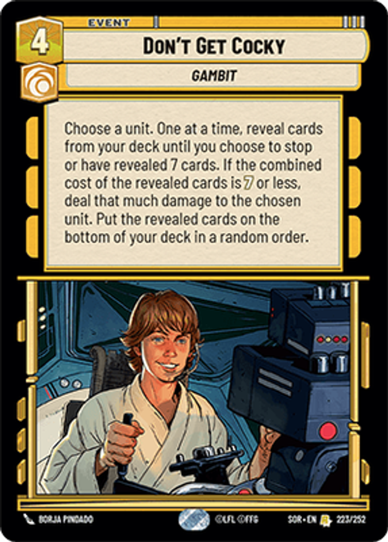 Choose a unit. One at a time, reveal cards from your deck until you choose to stop or have revealed 7 cards. If the combined cost of the revealed cards is 7 or less, deal that much damage to the chosen unit. Put the revealed cards on the bottom of your deck in a random order.