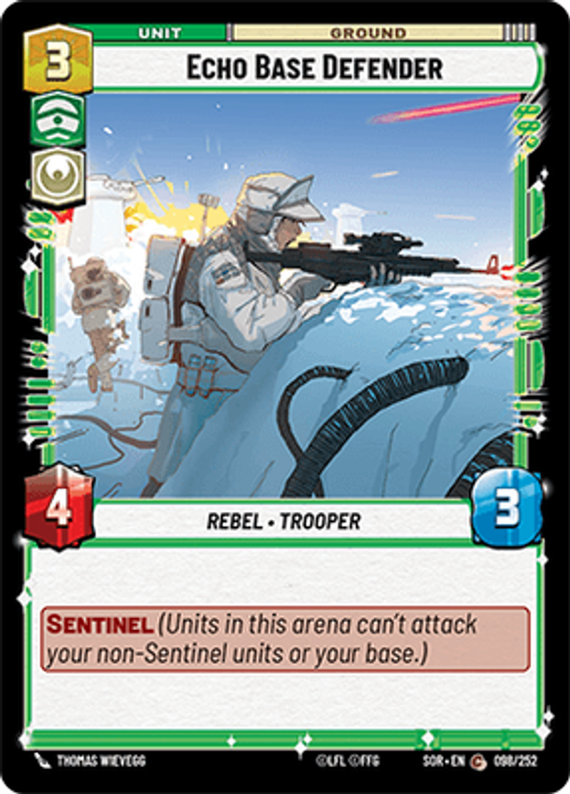 Echo Base DefenderRebel • TrooperSentinel (Units in this arena can’t attack your non-Sentinel units or your base.)Power: 4Health: 3Thomas Wievegg