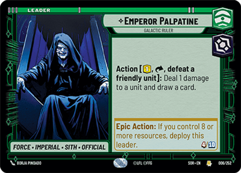 Emperor PalpatineGalactic RulerForce • Imperial • Sith • OfficialAction [1 resource, exhaust, defeat a friendly unit]: Deal 1 damage to a unit and draw a card.Power: 4Health: 10Borja Pindado