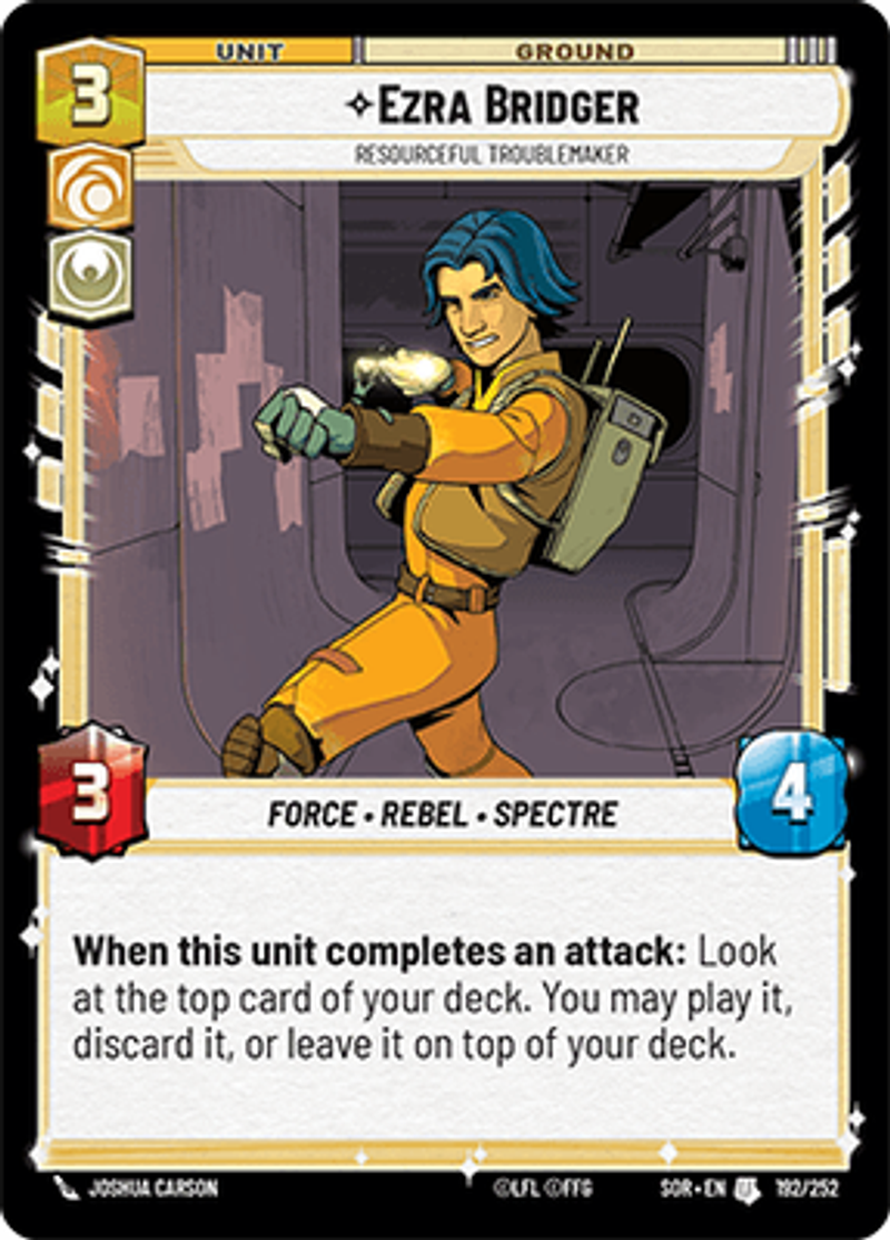 Ezra BridgerResourceful TroublemakerForce • Rebel • SpectreWhen this unit completes an attack: Look at the top card of your deck. You may play it, discard it, or leave it on top of your deck.Power: 3Health: 4Joshua Carson