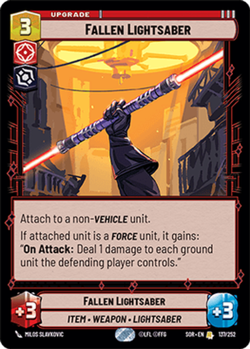 Fallen LightsaberItem • Weapon • LightsaberAttach to a non-Vehicle unit. If attached unit is a Force unit, it gains: "On Attack: Deal 1 damage to each ground unit the defending player controls."Power: 3Health: 3Milos Slavkovic