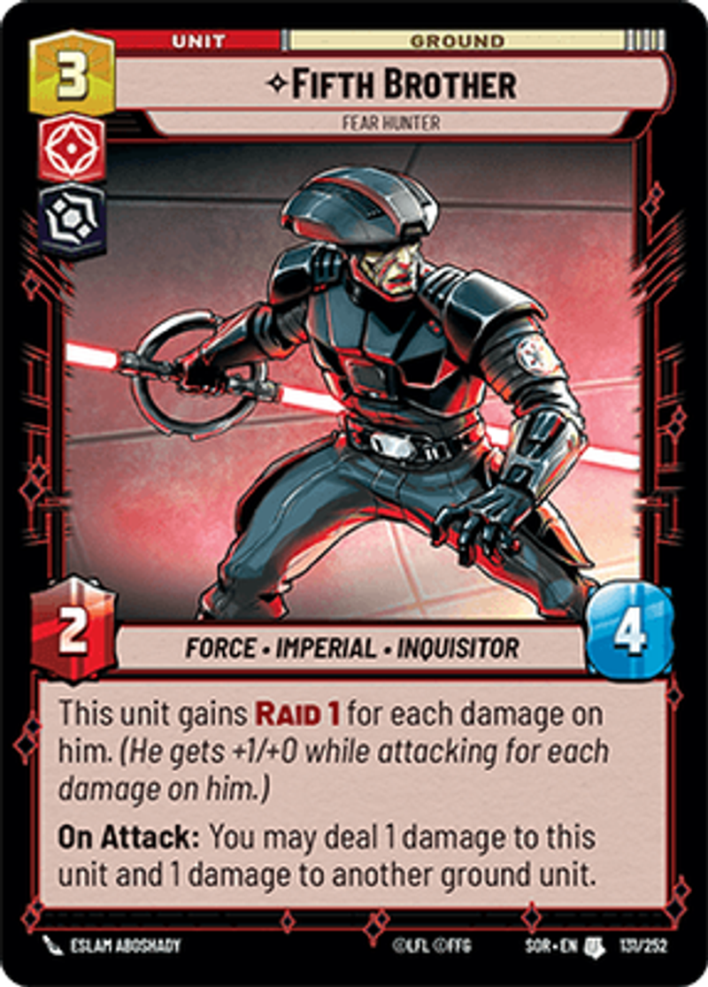 Fifth BrotherFear HunterForce • Imperial • InquisitorThis unit gains Raid 1 for each damage on him. (He gets +1/+0 while attacking for each damage on him.) On Attack: You may deal 1 damage to this unit and 1 damage to another ground unit.Power: 2Health: 4Eslam AboShady