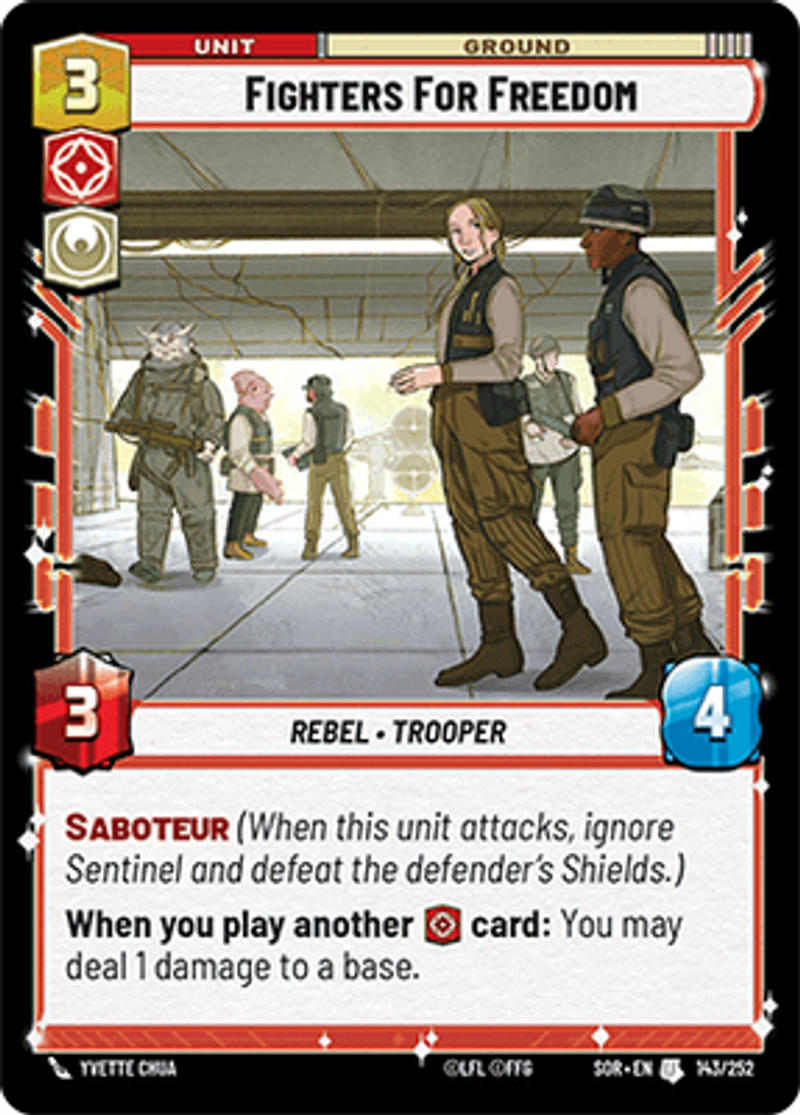 Fighters for FreedomRebel • TrooperSaboteur (When this unit attacks, ignore Sentinel and defeat the defender's Shields.) When you play another [Aggression] card: You may deal 1 damage to a base.Power: 3Health: 4Yvette Chua