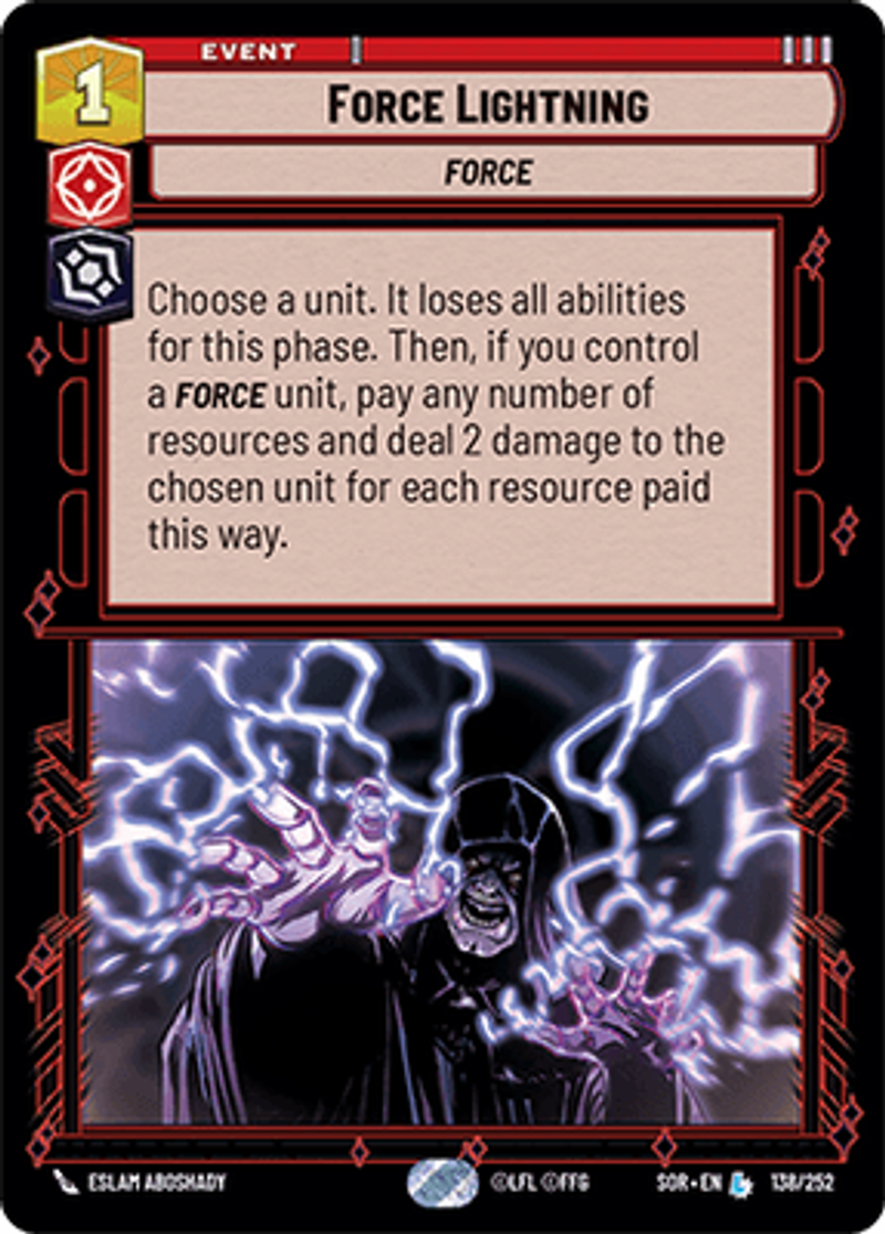 Force LightningForceChoose a unit. It loses all abilities for this phase. Then, if you control a FORCE unit, pay any number of resources and deal 2 damage to the chosen unit for each resource paid this way.Eslam AboShady