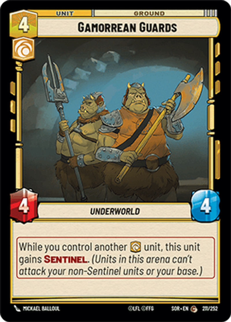 Gamorrean GuardsUnderworldWhile you control another [Cunning] unit, this unit gains Sentinel. (Units in this arena can’t attack your non-Sentinel units or your base.)Power: 4Health: 4Mickael Balloul