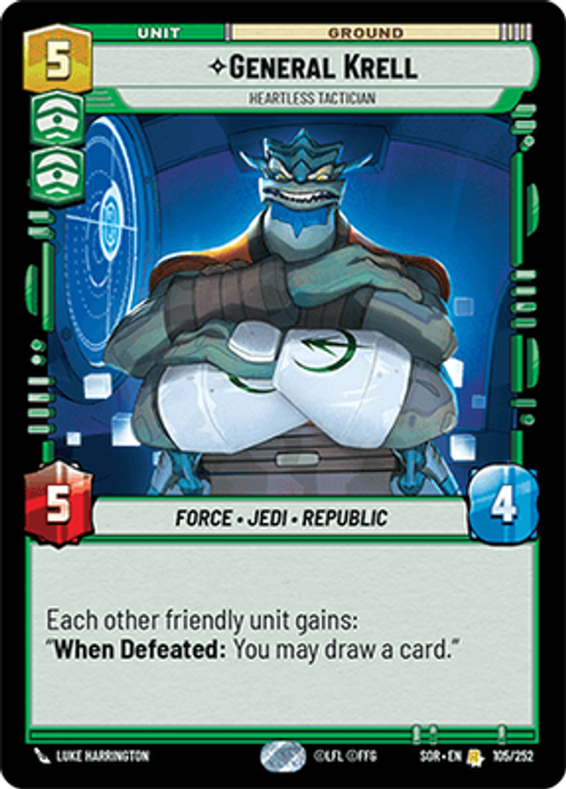 General KrellHeartless TacticianForce • Jedi • RepublicEach other friendly unit gains: “When Defeated: You may draw a card.”Power: 5Health: 4Luke Harrington