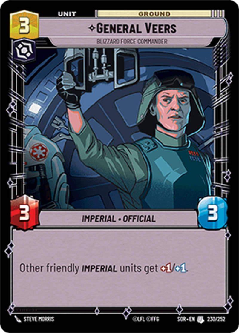 General VeersBlizzard Force CommanderImperial • OfficialOther friendly Imperial units get +1/+1.Power: 3Health: 3Steve Morris