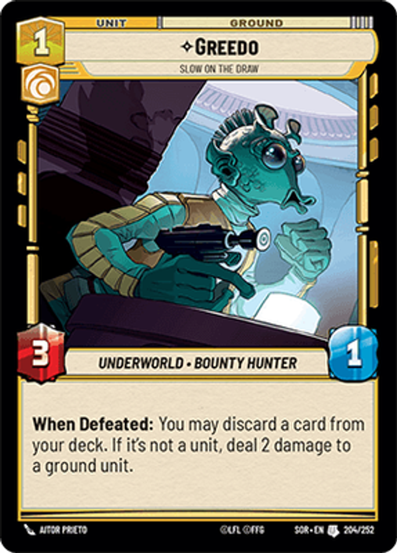 GreedoSlow on the DrawUnderworld • Bounty HunterWhen Defeated: You may discard a card from your deck. If it's not a unit, deal 2 damage to a ground unit.Power: 3Health: 1Aitor Prieto