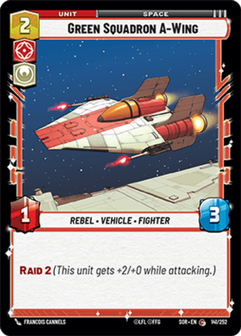 Green Squadron A-WingRebel • Vehicle • FighterRaid 2 (This unit gets +2/+0 while attacking.)Power: 1Health: 3Francois Cannels