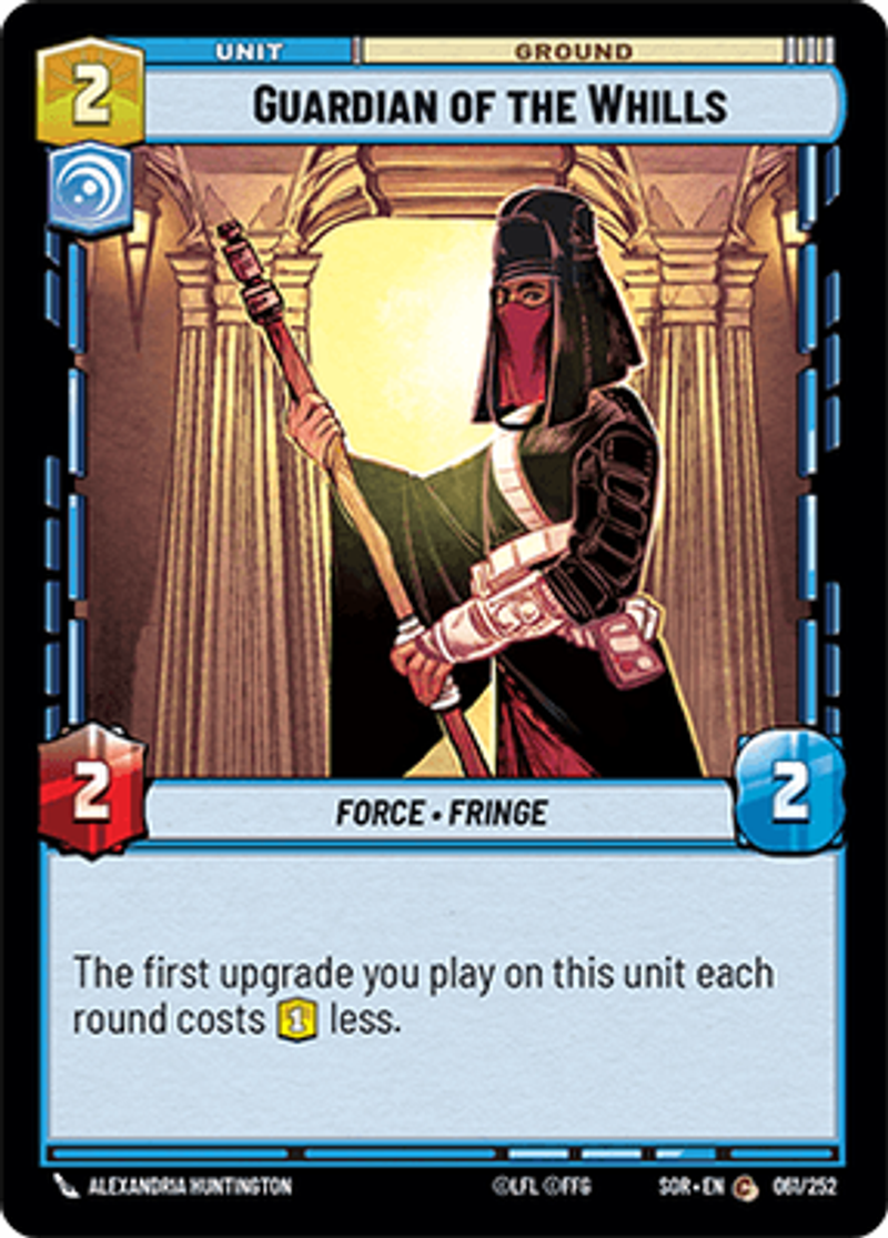 Guardian of the WhillsForce • FringeThe first upgrade you play on this unit each round costs [1 resource] less.Power: 2Health: 2Alexandria Huntington