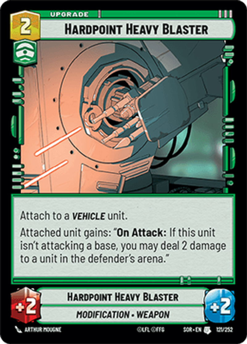 Hardpoint Heavy BlasterModification • WeaponAttach to a VEHICLE unit. Attached unit gains: "On Attack: If this unit isn't attacking a base, you may deal 2 damage to a unit in the defender's arena."Power: 2Health: 2Arthur Mougne