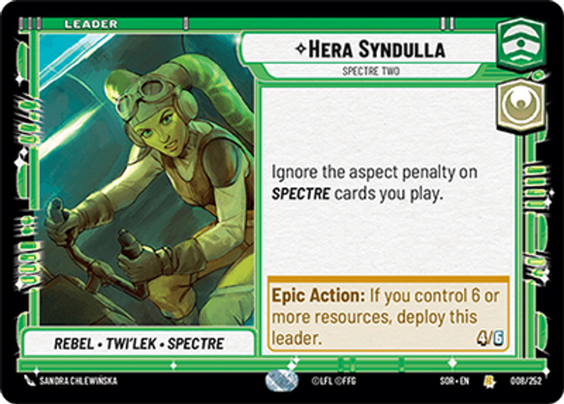 Hera SyndullaSpectre TwoRebel • Twi'lek • SpectreIgnore the aspect penalty on SPECTRE cards you play.Power: 4Health: 6Sandra Chlewińska