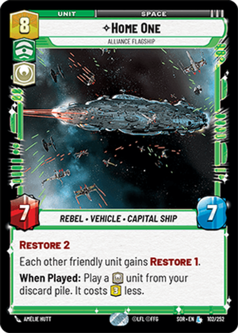 Home OneAlliance FlagshipRebel • Vehicle • Capital ShipRestore 2 Each other friendly unit gains Restore 1. When Played: Play a [Heroism] unit from your discard pile. It costs [3 resources] less.Power: 7Health: 7Amélie Hutt