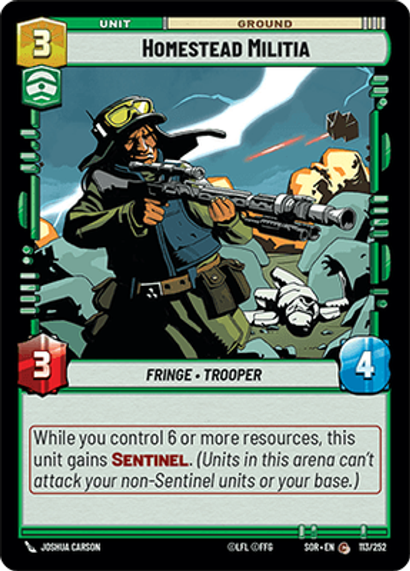 Homestead MilitiaFringe • TrooperWhile you control 6 or more resources, this unit gains Sentinel. (Units in this arena can't attack your non-Sentinel units or your base.)Power: 3Health: 4Joshua Carson