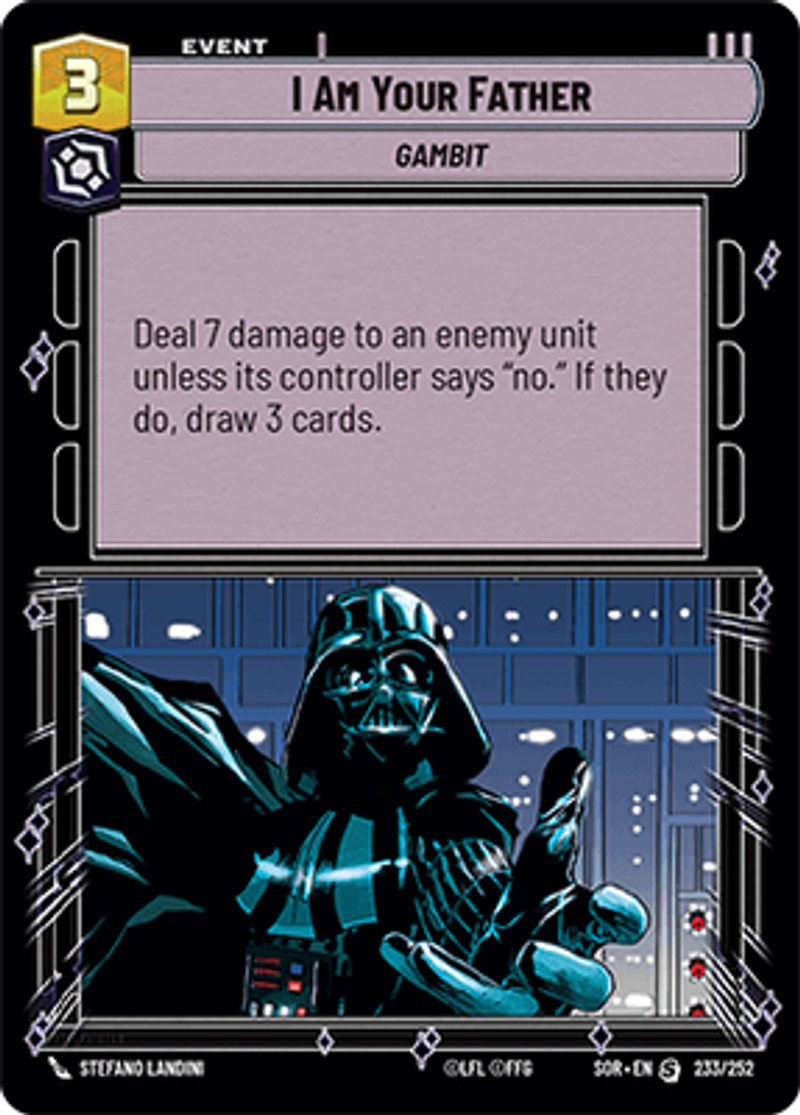 I Am Your FatherGambitDeal 7 damage to an enemy unit unless its controller says "no." If they do, draw 3 cards.Stefano Landini