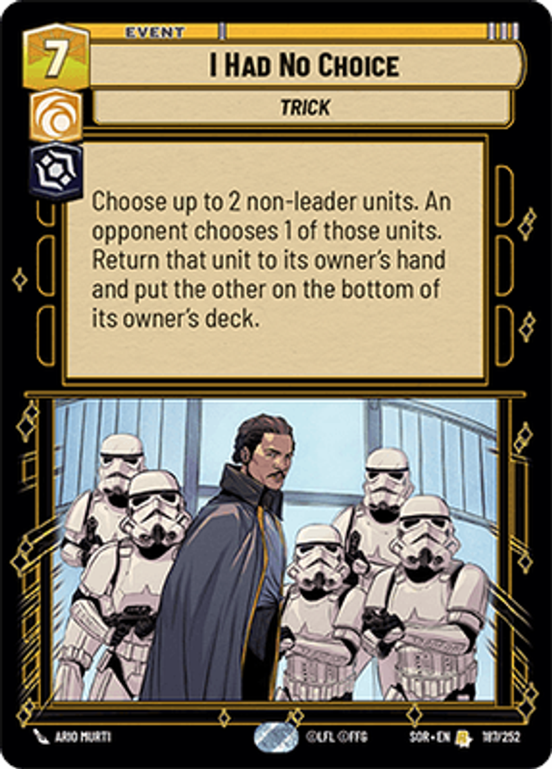I Had No ChoiceTrickChoose up to 2 non-leader units. An opponent chooses 1 of those units. Return that unit to its owner’s hand and put the other on the bottom of its owner’s deck.Ario Murti