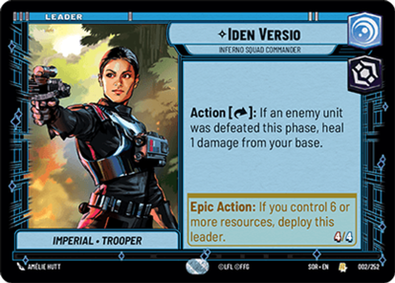 Iden VersioInferno Squad CommanderImperial • TrooperAction [Exhaust]: If an enemy unit was defeated this phase, heal 1 damage from your base.Power: 4Health: 4Amélie Hutt
