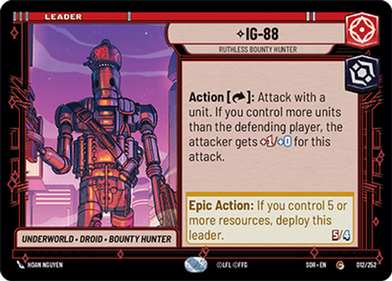 IG-88Ruthless Bounty HunterUnderworld • Droid • Bounty HunterAction [Exhaust]: Attack with a unit. If you control more units than the defending player, the attacker gets +1/+0 for this attack.Power: 5Health: 4Hoan Nguyen