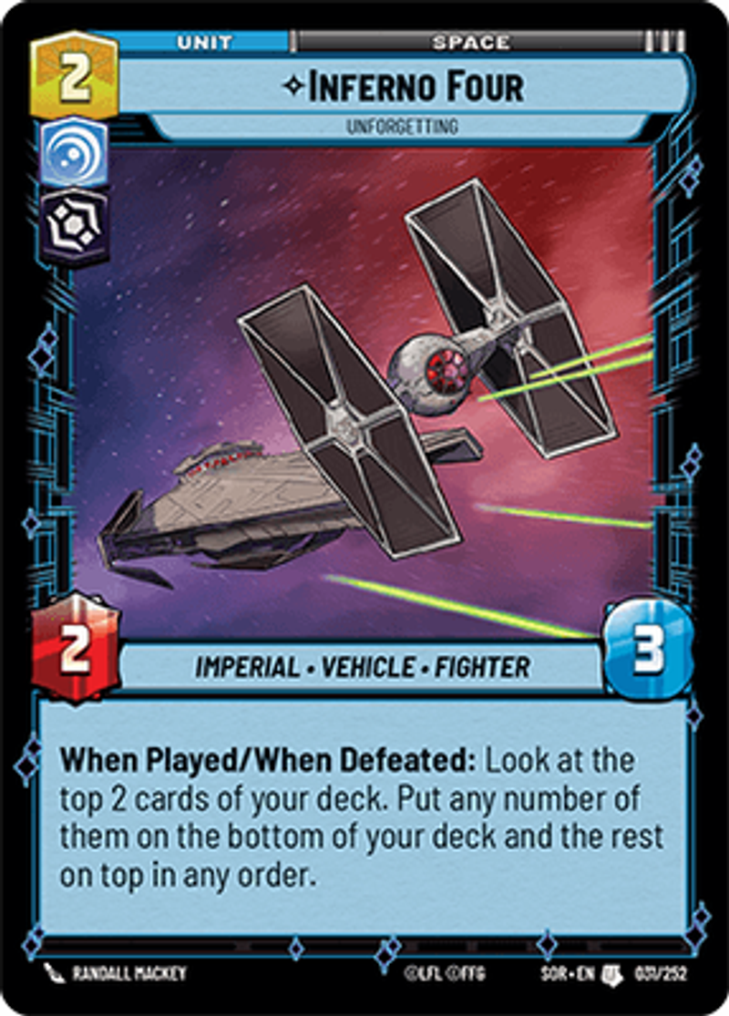 Inferno FourUnforgettingImperial • Vehicle • FighterWhen Played/When Defeated: Look at the top 2 cards of your deck. Put any number of them on the bottom of your deck and the rest on top in any order.Power: 2Health: 3Randall Mackey