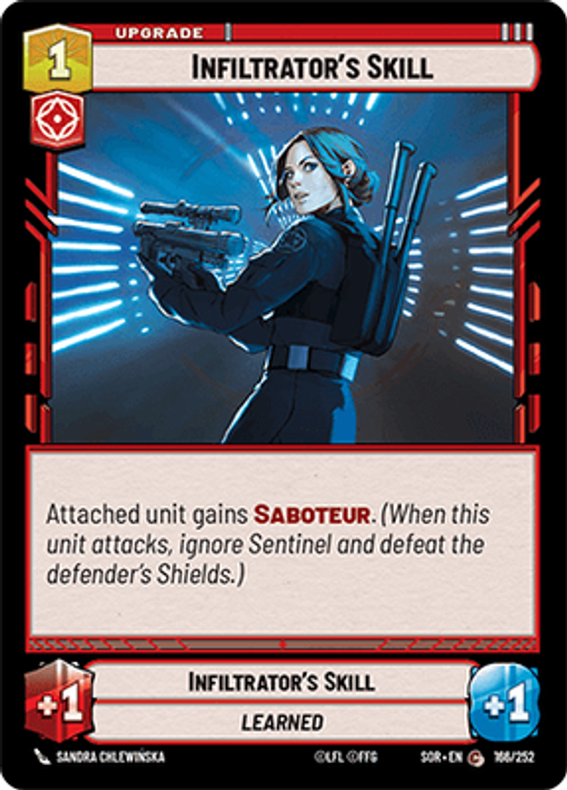 Infiltrator's SkillLearnedAttached unit gains Saboteur. (When this unit attacks, ignore Sentinel and defeat the defender's Shields.)Power: 1Health: 1Sandra ChlewiĆska