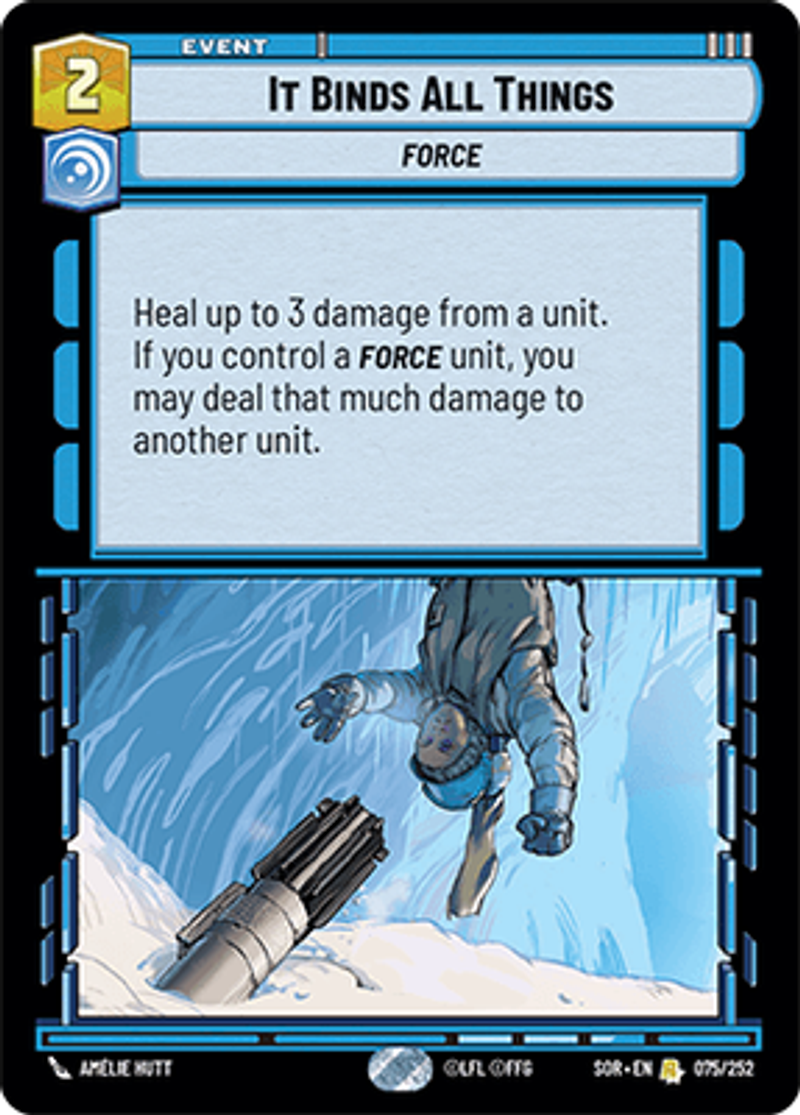 It Binds All ThingsForceHeal up to 3 damage from a unit. If you control a FORCE unit, you may deal that much damage to another unit.Amélie Hutt
