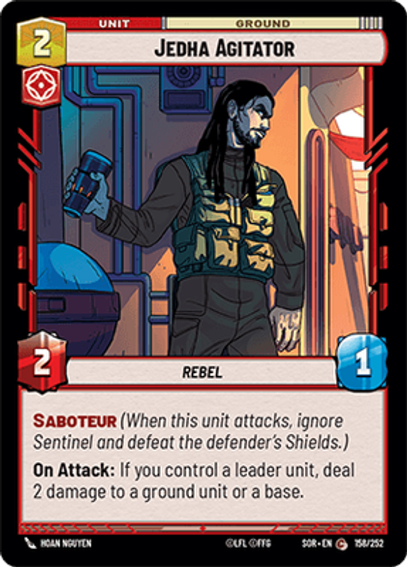 Jedha AgitatorRebelSaboteur (When this unit attacks, ignore Sentinel and defeat the defender’s Shields.) On Attack: If you control a leader unit, deal 2 damage to a ground unit or a base.Power: 2Health: 1Hoan Nguyen